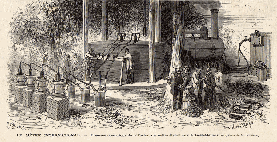 Cette image accompagne un article du Monde Illustré du 6 mars 1875. L'auteur évoque la fonte du platine iridié nécessaire à la fabrication du "mètre international définitif" : "Le platine iridié est tellement réfractaire qu'on n'aurait pu parvenir à le fondre sans l'intervention des chalumeaux à gaz oxy-hydrogène insérés dans le couvercle du creuset". |