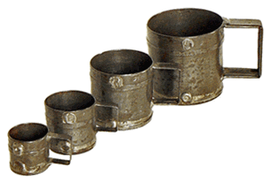 Intérieurement, la première mesure; pour le vin, est deux fois plus haute que large. Les trois autres ont un diamètre égal à la hauteur (le fond de la mesure en bois, est surélevé). |