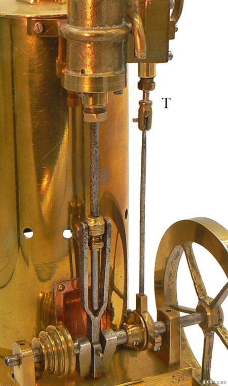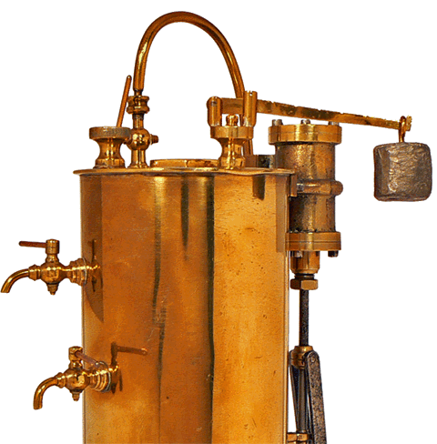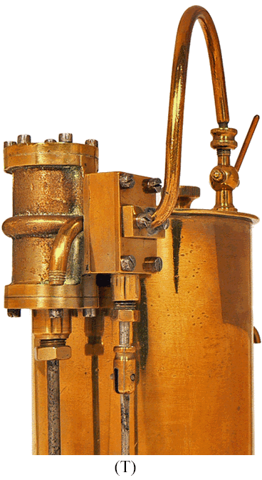 Sur l'enveloppe cylindrique de la chaudière, le robinet supérieur correspond au trop plein du réservoir d'eau, générateur de vapeur, tandis que le robinet inférieur est utilisé pour la vidange. En haut de la machine, au dessus des robinets, on distingue le bouchon à vis destiné au remplissage en eau du réservoir. |