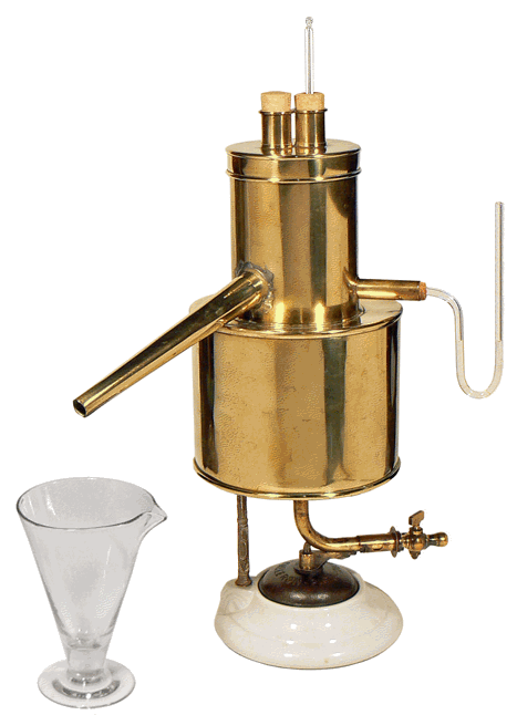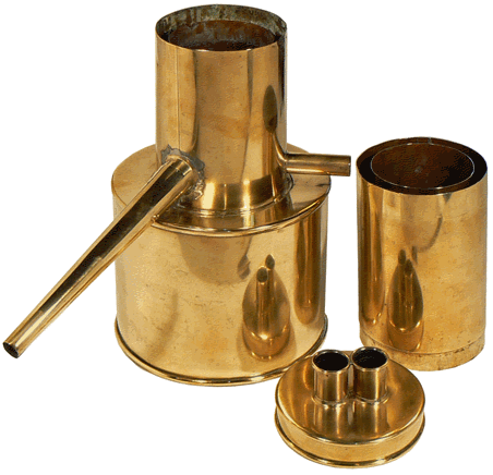 L'exemplaire présenté possède un couvercle à deux tubulures : il est possible de repérer simultanément les points 100 de deux thermomètres ou encore de faire une comparaison entre le thermomètre à traiter et un thermomètre de référence. Le manchon cylindrique supplémentaire est utilisé lorsque le thermomètre est de grande taille. La hauteur de l'étuve, sans l'appareil de chauffage, est alors égale à 39 cm. C'est le cas correspondant à l'image ci-dessous. |