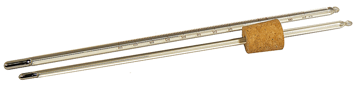 Le thermomètre muni du bouchon en liège n'est pas encore gradué. Après repérage des deux points fixes - le "zéro" dans la glace fondante et le "100" dans la vapeur d'eau en ébullition de l'étuve de Regnault - l'intervalle sera divisé en 100 parties égales... |