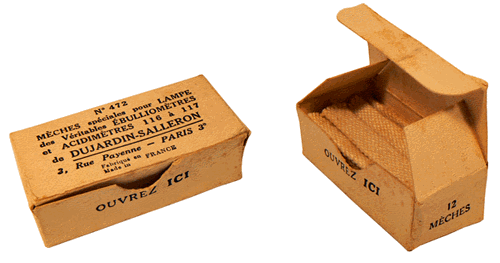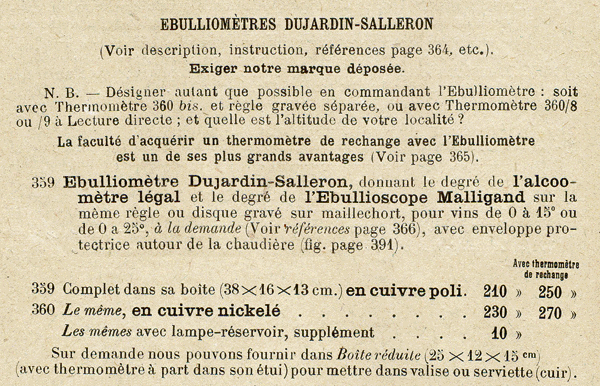 Ebullioscope pour Malligand et Levesque, ébulliomètre pour Dujardin-Salleron, ébulliographe pour Barus : le principe de la détermination du degré alcoolique est le même mais chacun des instruments de dosage demeure unique ou presque. La concurrence devait être rude, dans la première moitié du XXe siècle si on en croit certains propos rencontrés dans les catalogues ou ouvrages de l'époque énumérant les avantages de l'ébulliomètre Dujardin-Salleron "construit en 1880 et perfectionné sans cesse" : (...) Appareil vertical, robuste, peu encombrant. Aucune vis, cause de fuite, aucun bras coudé rendant l'appareil instable et sans aplomb (...) Thermomètre distinct, facile à remplacer immédiatement sans obligation de retour d'aucune pièce d'où : économie (...). Il suffit de regarder l'ébullioscope concurrent, dont le Compendium renferme un exemplaire, pour comprendre le choix des arguments. Mais, nous ne sommes pas là pour rallumer la mèche ... |
