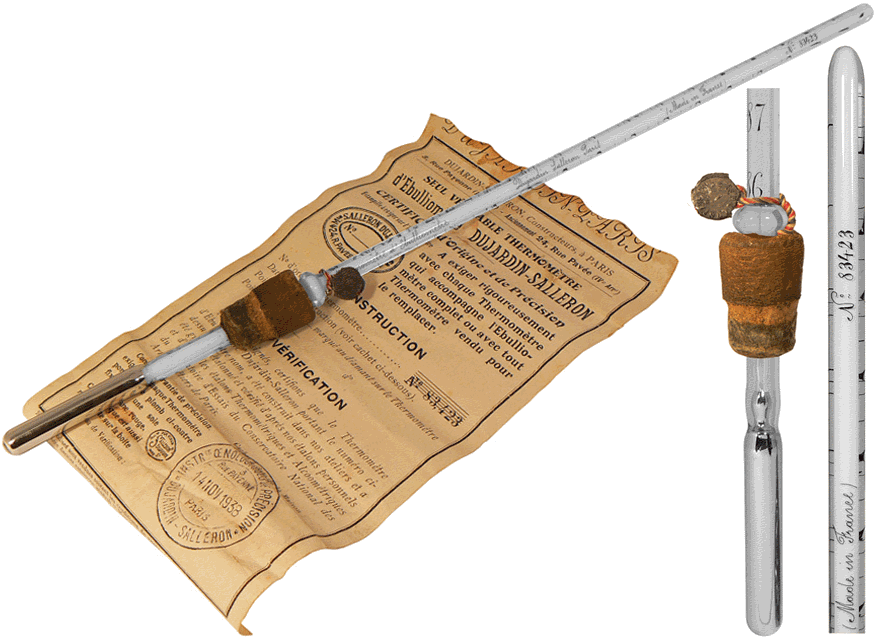 Notre ébulliomètre date de 1946, comme l'indique les deux premiers chiffres du numéro qu'il porte, mais le thermomètre possède son certificat d'origine et de précision établi en 1938. Le plomb de garantie, à la marque Dujardin-Salleron, est fixé par un fil en soie tressée dont les couleurs, bleu-blanc-rouge, sont un peu passées mais bien présentes ... |