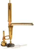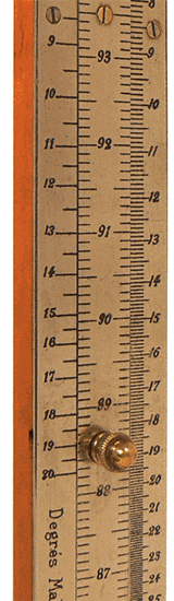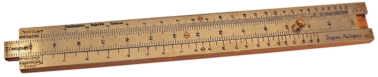 Dans les coffrets contenant le matériel, le disque ébulliométrique a, peu à peu, remplacé la règle en maillechort sur support en bois de poirier. Le principe reste le même : la partie mobile porte l'échelle thermométrique et de part et d'autre, sont gravées l'échelle exprimée en degrés alcooliques du vin et l'échelle en degrés Malligand. |