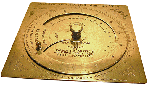 L'ébulliomètre est utilisé pour le dosage du vin. Son principe repose sur la variation de la température d'ébullition d'un vin en fonction de sa concentration en alcool : plus la teneur en alcool est importante, plus la température d'ébullition est faible. La correspondance étant établie entre les deux grandeurs, il suffit de relever la température d'ébullition d'un vin pour en déduire, à l'aide d'un tableau ou mieux, d'une règle ou d'un disque ébulliométrique, la quantité d'alcool présente. Le degré alcoolique correspond au nombre de centilitres d'alcool éthylique présents dans 1 litre de vin. |