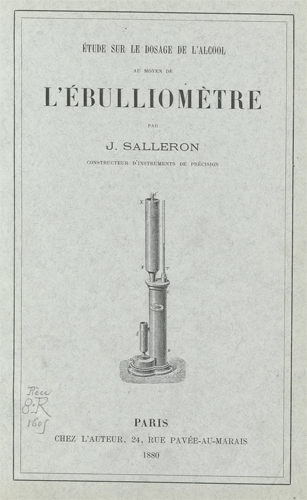 L'image, à gauche, représente la couverture d'un livret proposé par Jules SALLERON en 1880 : ÉTUDE SUR LE DOSAGE DE L'ALCOOL AU MOYEN DE L'ÉBULLIOMÈTRE. Le document d'une vingtaine de pages est proposé dans son intégralité par Gallica, bibliothèque numérique de la BnF. Il suffit de cliquer sur l'image pour l'atteindre. |