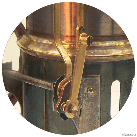 La chaudière est munie d'une soupape de sureté constituée par un levier auquel est assujetti un bouchon cylindrique à base conique. En temps normal (image de gauche) le cône obture un petit orifice, extrémité du canal en communication avec la chaudière. Un contrepoids, fixé à l'extrémité du levier, est calculé pour supporter une pression donnée. Si la pression de la vapeur, dans la chaudière, prend une valeure trop importante, elle pousse le cône et s'échappe... |
