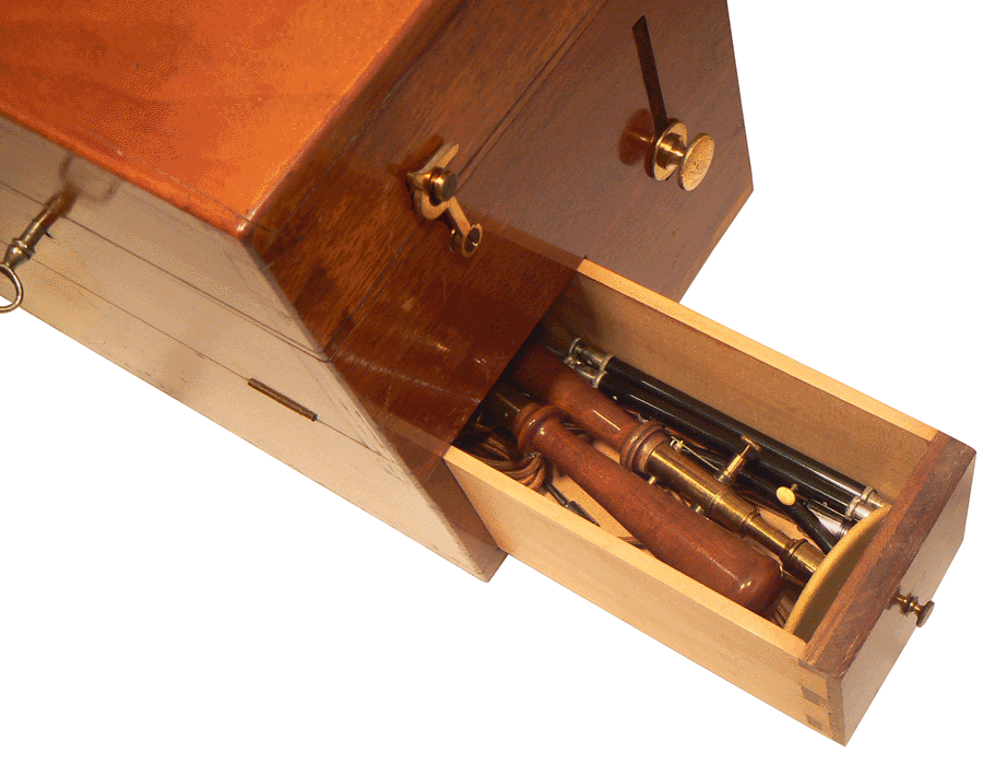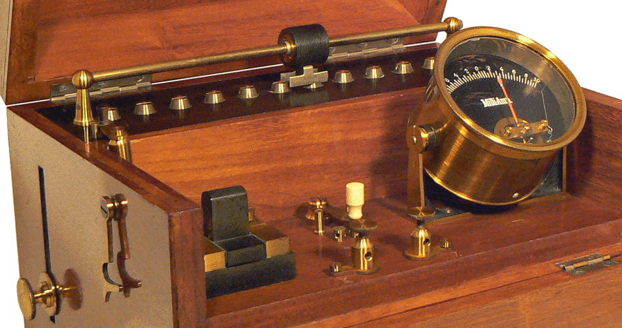 Coffret d'appareil à courant continu ("courant gavanique") en acajou verni - Dimensions : 24 x 18 x 21 cm - Vers 1900 |