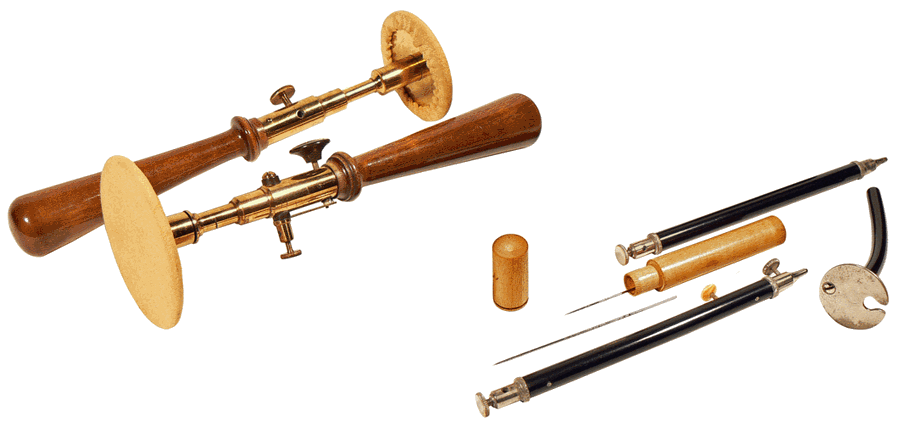 Ce type de générateur de courant continu est utilisé dès la deuxième partie du 19ème siècle pour l'alimentation des appareils d'exploration des cavités du corps humain, la cautérisation et l'électrothérapie, c'est-à-dire l'électrisation de certains organes ou tissus humains dans le but de soigner. Pour "appliquer l'électricité", on a recours à des excitateurs de différentes formes, semblables à ceux que l'on trouve dans les coffrets d'électrothérapie faradique. |