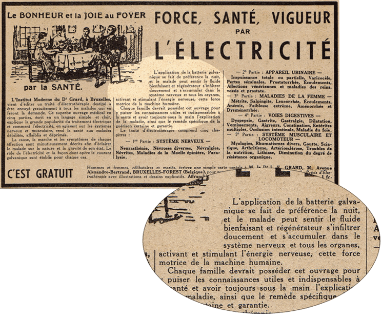 De nombreux ouvrages de la fin du XIXe siècle traitent des réelles possibilités offertes par l'électricité dans le champ de la médecine. Certains auteurs, médecins ou physiciens, mettent toutefois en garde face à une médecine parallèle qui affirme pouvoir tout guérir. Dans ses NOTIONS D'ÉLECTRICITÉ, l'auteur, J. Baille, énumère en 1888 les "inventions électriques" issues du charlatanisme : "[...] Ici on proclame des chaînes galvaniques, là des bagues électriques, plus loin des buses galvaniques, des ceintures, des brosses, des cravates, des sachets, doués des plus merveilleuses propriétés. Ce sont là des prétentions exagérées. Mais de ce que l'électricité ne peut devenir un remède universel, il ne faut pas conclure qu'elle ne soit pas propre à soulager et même à guérir certains maux [...]" |