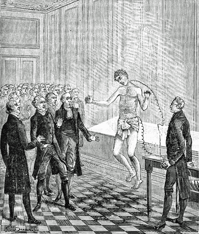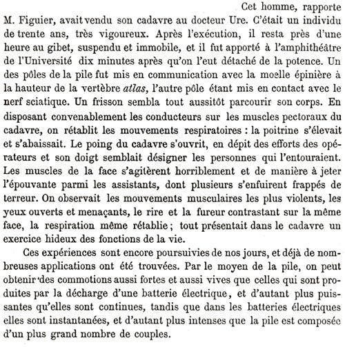 Dans son ouvrage PHYSIQUE ET CHIMIE POPULAIRES, paru sous forme de fascicules au début des années 1880, Alexis CLERC évoque l'action physiologique de l'électricité sur les animaux. Il décrit ensuite une expérience réalisée en 1818 par le docteur Andrew Ure à Glascow, sur le corps d'un assassin nommé Clysdale : |