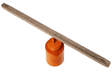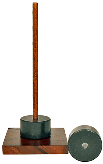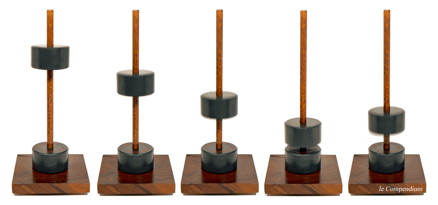 Deux aimants cylindriques puissants sont percés de part en part suivant leur axe de symétrie. L'un des aimants, fixe, est déposé à la base d'une tige verticale en bois ciré dont le diamètre est légèrement inférieur à celui de la perforation des aimants. L'autre aimant, mobile, est libéré du haut de la tige. La face inférieure de ce deuxième aimant est de même nom que la face supérieure du premier