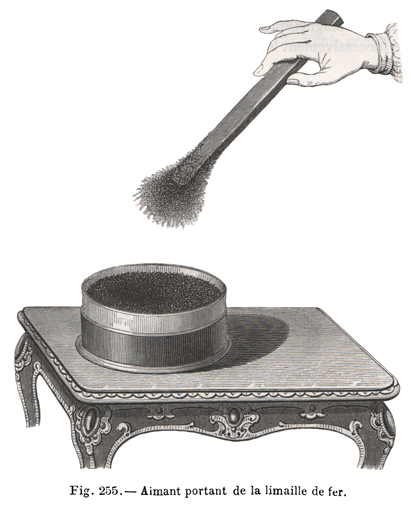 C'est l'aimantation par influence qui explique la formation de la houppe au pôle de l'aimant lorsqu'on plonge l'une de ses extrémités dans la limaille de fer. Chaque parcelle de métal agit sur la parcelle voisine.