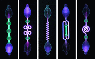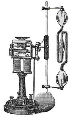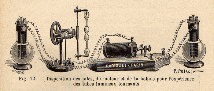 Les tubes de Geissler contiennent sous atmosphère raréfiée, ainsi que dans le verre de leur enveloppe, des traces de substances phosphorescentes ou fluorescentes. Lorsqu'ils sont traversés par le courant induit fourni par une bobine de Ruhmkorff, ils fournissent une lumière stratifiée intense dont les couleurs dépendent des éléments présents. Les effets sont plus spectaculaires lorsque le tube est animé d'un mouvement de rotation. Ce petit moteur, dont il existe différentes formes, est précisément destiné à recevoir l'un de ces tubes pour le faire tourner sur lui-même tout en assurant sa liaison avec la bobine de Ruhmkorff |