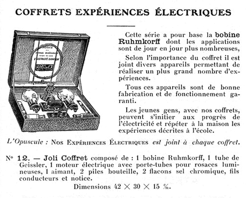 Le coffret n° 12 proposé permettant de réaliser quelques expériences autour du moteur porte-tube de Geissler et de la bobine de Ruhmkorff était, alors, proposé à 85 francs. |