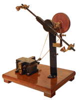 A l'arrière du moteur une petite roue à six dents solidaire du rotor en fer doux assure, par contact intermittent avec une lame de cuivre, le passage du courant dans l'électroaimant : par suite, les palettes du rotor sont attirées l'une après l'autre et le moteur tourne. Sur la photo de droite, les deux brins métalliques du porte-tube sont fixés au moyeu isolant en buis : ils sont électriquement indépendants l'un de l'autre. Le brin actuellement supérieur est en contact avec l'axe du moteur par l'intermédiaire d'un manchon métallique intérieur au moyeu tandis que le brin actuellement inférieur est relié à un collecteur périphérique sur lequel frotte une lame en cuivre. Le courant de décharge de la bobine de Ruhmkorff peut ainsi être amené aux extrémités du tube de Geissler que l'on insère entre les deux contacts à ressort.. |
