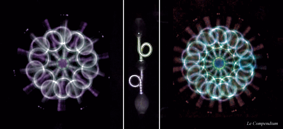 De part et d'autre de la photographie d'un tube immobile, les images obtenues lors de sa mise en rotation. |