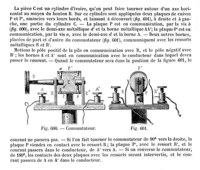Le commutateur-inverseur de Ruhmkorff permet d'établir ou de supprimer le courant dans la bobine inductrice et d'inverser le sens du courant. Il est placé entre les bornes d'alimentation. |