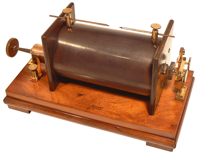 Le socle en noyer de la bobine est évidé et renferme un condensateur à feuilles d'étain de Fizeau. Le rôle de ce condensateur est de rendre plus rapide l'interruption du courant inducteur et d'augmenter ainsi la tension du courant induit. |