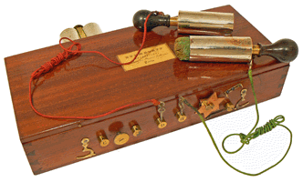 Les vignettes qui suivent mènent a des pages du Compendium relatives à Ruhmkorff, à des petites bobines de type Ruhmkorff, et à un coffret d'électrothérapie sorti de ses ateliers. Il suffit de cliquer sur une vignette pour entrer directement sur la page qui lui correspond. |