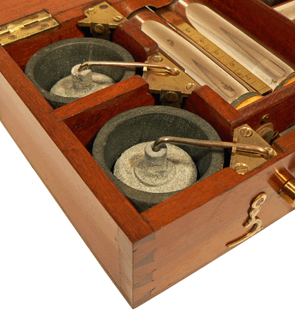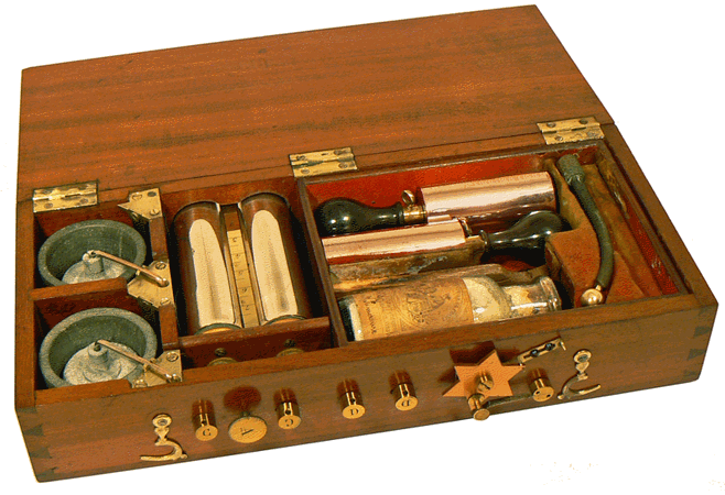 Dans la partie gauche du coffret se trouve l'alimentation constituée par une pile au sulfate de mercure (II) - on parlait autrefois de "bisulfate de mercure" - et, à la suite, le compartiment des bobines d'induction actuellement recouvertes du double cylindre graduateur. Plus à droite et au fond sont rangées les deux électrodes cylindriques porte-éponge et, au premier plan, le flacon d'électrolyte sous sa forme cristallisée. Dans la partie droite du coffret on distingue une électrode excitatrice courbe, terminée par une olive puis un emplacement vide qui devait contenir une électrode constituée par un pinceau de fils métalliques. |