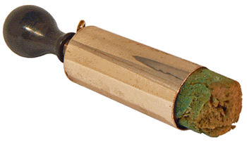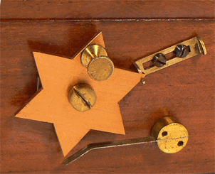 On peut provoquer des électrisations et coupures saccadées et franches plus espacées que lors de l'utilisation simple du trembleur. Les secousses ressenties, dues à l'extra-courant, sont plus fortes. Cet interrupteur est accompagné d'un dispositif de verrouillage en position "circuit ouvert" comme on le voit sur l'image de droite. |