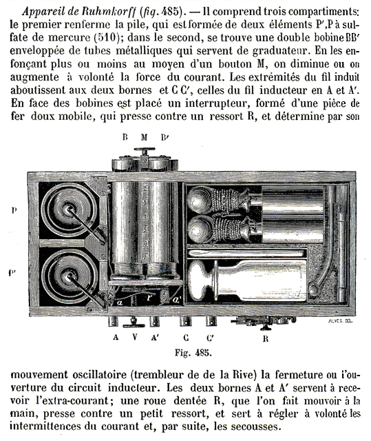 On distingue, à gauche dans le petit compartiment, l'interrupteur à marteau ou trembleur ainsi que, au-dessus, les bobines qui sont, actuellement, partiellement recouvertes par le double cylindre graduateur. Au moment de l'induction, ce double cylindre graduateur, ou diaphragme, devient aussi le siège de courants induits qui tendent à s'opposer à ceux qui se produisent dans les bobines. |