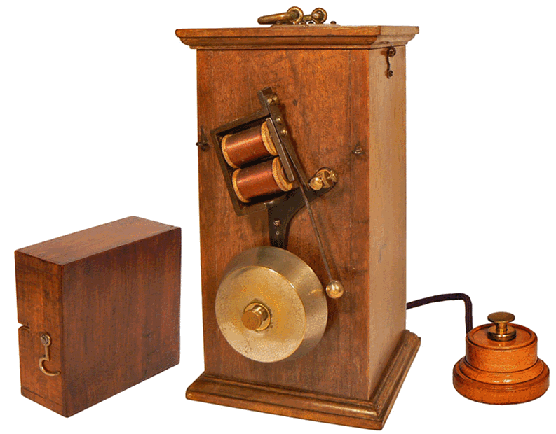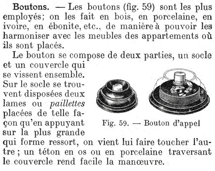 Ce modèle, fait pour être déplacé, possède le même mécanisme que précédemment fixé sur l'une des faces d'un coffret renfermant la pile qui l'alimente. A l'origine, l'extrémité du cordon de connexion n'aboutissait pas directement à la "pédale de parquet" comme c'est ici le cas, mais à une fiche à deux broches adaptable à une base de prise spécifique, fixe. Dans une vaste demeure, de telles bases de prises pouvaient être réparties dans les différentes pièces et reliées au bouton d'appel placé dans le bureau ou le salon du maître de maison. Lorsque ce dernier avait besoin d'appeler un employé de maison - un employé qui, bien sûr, branchait toujours son coffret là où il se tenait - il lui suffisait de le "sonner" en pressant le bouton d'appel ... |