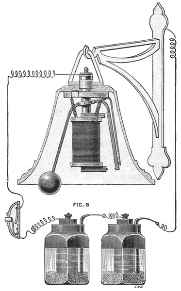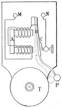 Comme le montre le schéma emprunté au Traité d'ÉLECTRICITÉ d'Alfred Soulier, la sonnerie se compose d'une planchette sur laquelle est fixé un électroaimant A, dans lequel arrive, par une borne M, le courant de ligne, ou le courant d'une pile locale. De l'électroaimant, le courant gagne une lame élastique en acier C, qui porte l'armature B et vient toucher la pointe d'une vis placée latéralement et qui communique avec le fil ou la barrette de retour vers la borne N. |