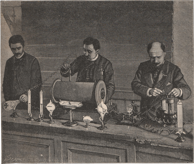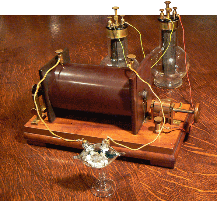 Le montage tel qu'il aurait pu être réalisé vers 1900. Aujourd'hui, la bobine de Ruhmkorff est toujours utilisée mais les deux piles Grenet et les connexions ont été remplacées par du matériel plus actuel. |