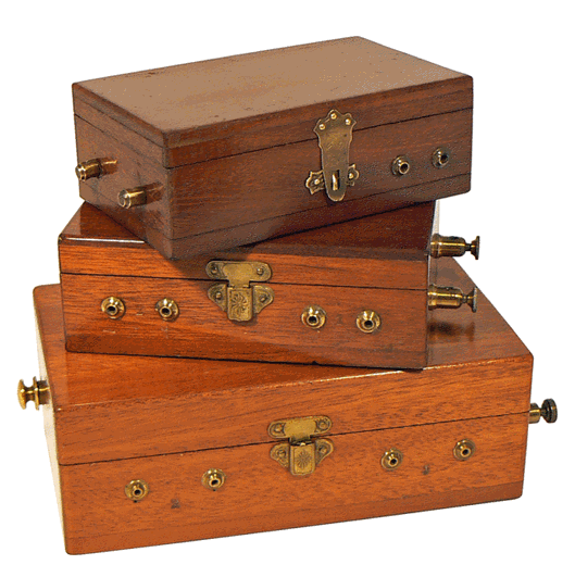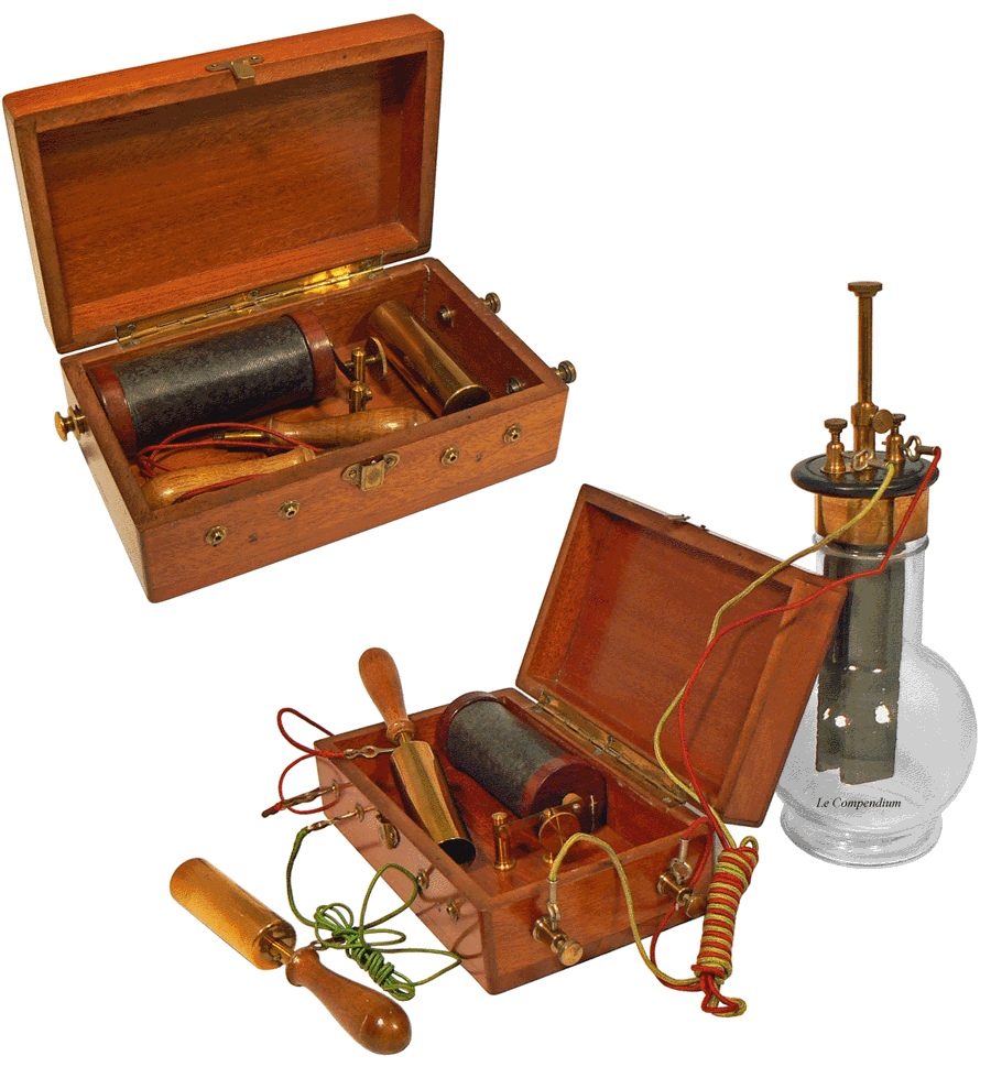 A la fin du 19ème siècle et jusque dans les années 1920, des appareils d'induction sont proposés, à des fins quelquefois "médicales" mais surtout ludiques, dans des petits coffrets en noyer ou en acajou. On y trouve uniquement les cordons de connexion et les électrodes métalliques, cylindriques et creuses ou "manipules", que l'on fait tenir à pleines mains par un sujet qui, au passage du courant, reçoit des secousses peu agréables ... Ces appareils, souvent sans marque apparente, nécessitent l'utilisation d'une pile externe telle une pile Grenet. |
