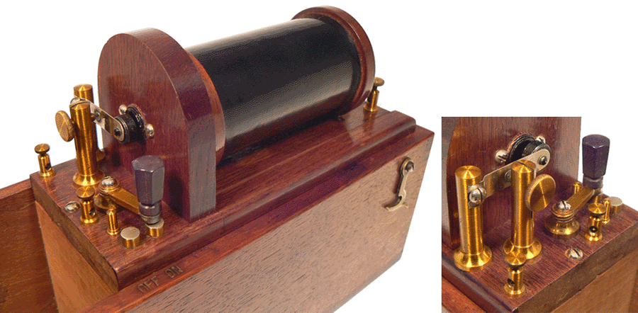 L'appareil présente, d'un côté, les deux bornes d'alimentation de l'inducteur, l'interrupteur à marteau ou trembleur, et le commutateur dont on repère les positions "OFF" et "ON". La pile est, soit contenue dans le compartiment spécifique que l'on remarque à gauche, soit extérieure. |