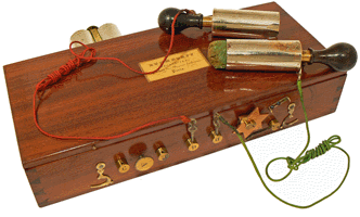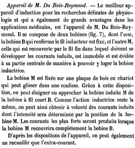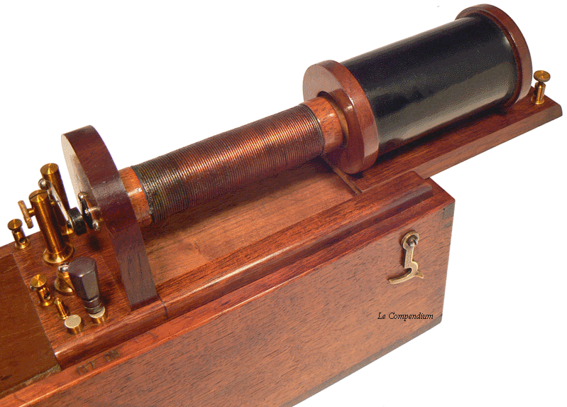 On reconnait facilement des organes similaires à ceux de la bobine de Ruhmkorff dont le principe est développé sur une autre page du Compendium. Toutefois, un élément important distingue l'appareil de Du Bois-Reymond, médecin et physiologiste allemand : la bobine induite peut se déplacer suivant son axe. Dans le TRAITÉ D'ÉLECTRICITÉ MÉDICALE, E. Onimus et Ch. Legros décrivent les appareils "électro-magnétiques" à usage médical. A l'époque - nous sommes en 1872 - les coffrets pour électrothérapie de Ruhmkorff et de Gaiffe sont les plus employés. Ils sont jugés "très commodes et capables de donner, sous un petit volume, des courants d'induction très énergiques". L'appareil de Du Bois-Reymond est, lui, remarqué par la possibilité qu'il offre de faire varier la distance entre bobine d'induction et bobine induite mobile. Par suite il est plus facile de graduer la force électromotrice induite. |