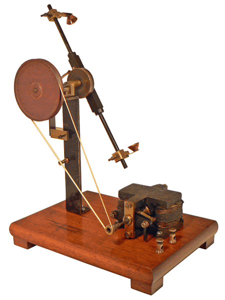 Il s'agit d'un dispositif tourne-tube de Geissler de grande taille. La partie destinée à recevoir le tube à décharge est distincte du moteur d'entraînement. ce qui différencie l'instrument des modèles classiques, plus petits et plus compacts. Le moteur est alimenté par les deux bornes visibles sur la droite du socle. |