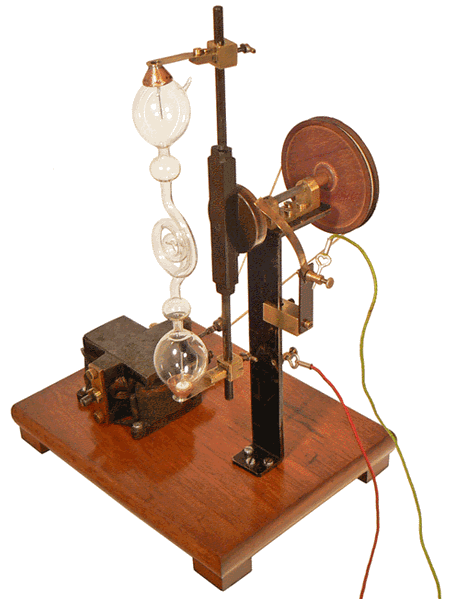 La potence métallique noire portant l'axe de rotation du tourne-tube et la lame en cuivre frottant sur le collecteur circulaire sont isolées l'une de l'autre par une plaquette en bakélite. On comprend que les deux fiches, actuellement branchées et qui terminent les cordons de connexion vert et rouge, sont reliées aux extrémités du tube de Geissler. |