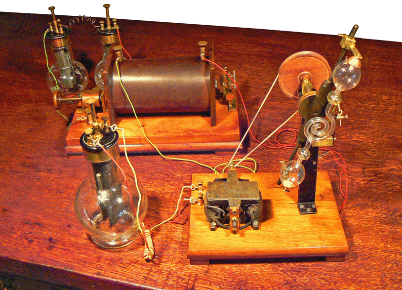 Les vignettes qui suivent mènent aux pages du Compendium relatives, les deux premières à différentes bobines de Ruhmkorff, la troisième au petit moteur tourne-tube de Geissler. La grande image conduit aux tubes de Geissler. Il suffit de cliquer sur une des représentations pour entrer directement sur la page qui lui correspond. |