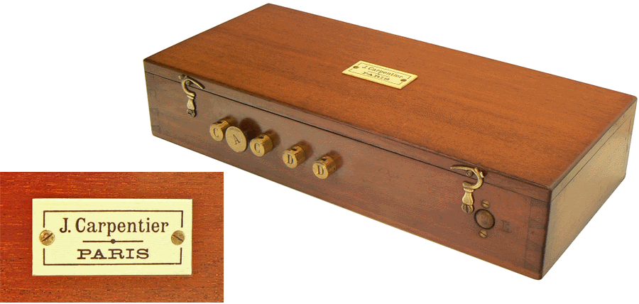 Ce coffret proposé par Jules Carpentier est, à un "détail" près, celui créé par Ruhmkorff et qui correspond au dessin emprunté au TRAITÉ D'ÉLECTRICITÉ MÉDICALE de 1872 par E. Onimus et Ch. Legros. En fait, en 1878, un an après la mort de Ruhmkorff, Jule Carpentier, alors jeune polytechnicien, obtient aux enchères la totalité de ce que laisse le grand constructeur. Il crée alors la société "Ateliers Ruhmkorff - J. Carpentier Ingénieur Constructeur". Il semble logique qu'il ait repris la fabrication de cet article dont le succès était déjà très grand... |