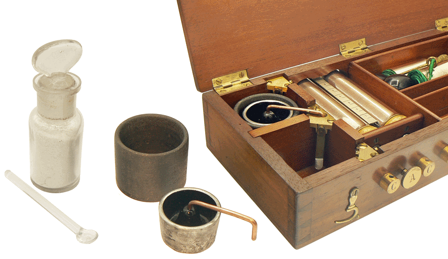 Les enroulements primaires des bobines sont alimentés par deux piles du type Marié-Davy. Chacune est constituée d'un godet en charbon de cornue d'un peu plus de 4 cm de diamètre, pôle positif, recevant une solution de sulfate de mercure (II) dans laquelle plonge un cylindre en zinc, pôle négatif. On remarque, dans le compartiment actuellement vide du coffret, la lame ressort métallique réalisant le contact avec le godet positif... A gauche sur la photographie, le flacon à col rodé contenant l'électrolyte cristallisé ainsi que la petite cuillère en verre, ont leur place dans le coffret. |