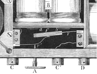 L'image, à droite, montre le trembleur de Neef, interrupteur permettant d'ouvrir et de fermer régulièrement et rapidement le circuit alimenté par les piles. Son armature en fer doux f est mobile à l'extrémité du ressort de rappel r. Lorsque f est en contact avec le ressort r', le circuit est fermé et le courant circule dans l'enroulement primaire de chaque bobine. L'extrémité a d'un du noyau de fer doux d'une bobine agit alors sur l'armature f et, l'attirant, ouvre le circuit... L'armature f oscille entre les deux positions, ouvrant et fermant le circuit électrique à fréquence rapide et réglable par action sur le bouton A. Les deux bornes C et C' sont reliées, respectivement à r' et à r : elles délivrent l'extra courant. Les bornes D et D' sont reliées aux extrémités des enroulements secondaires des bobines : elles délivrent le courant induit. |