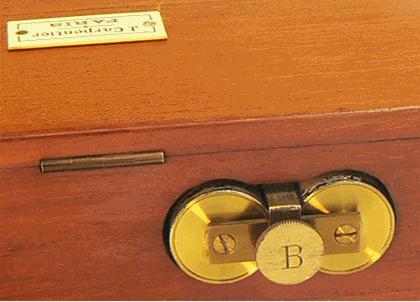 Pour régler la force du courant induit, deux cylindres en cuivre argenté forment un double manchon mobile recouvrant les bobines. Ces cylindres deviennent le siège de courants induits en minimisant ceux que recueillent le patient On peut, à l'aide du bouton B, les déplacer de manière à ce qu'ils recouvrent plus ou moins les enroulements secondaires. Plus grande est la partie des bobines recouverte par le double manchon et plus faibles sont les courants. Si le double manchon est retiré, les secousses sont plus énergiques... |