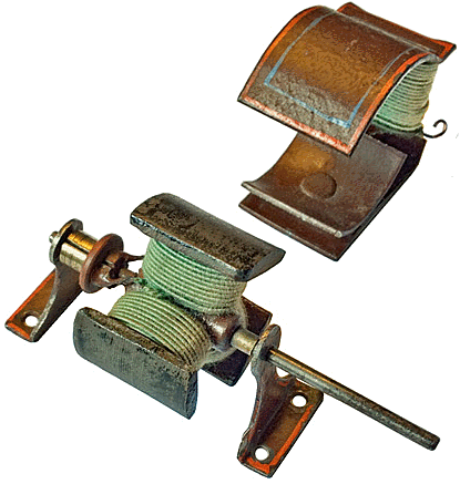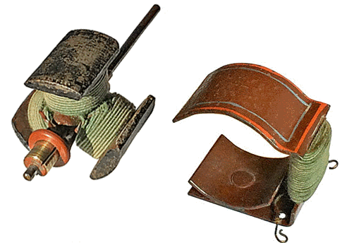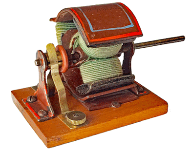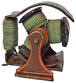 Le rotor, au centre, est formé par trois bobines à l'extrémité épanouie disposées en étoile et dont les enroulements, reliés au collecteur rotatif à trois secteurs, sont alimentés par les balais comme on le voit sur l'image de gauche. Le stator, à droite, est constitué par un enroulement réalisé autour d'une cage constituée de fines plaques de fer doux. |