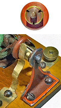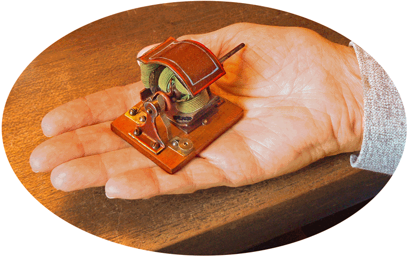 Un de ces moteurs est photographié près de notre spécimen. On peut observer des similitudes quant aux dimensions et à la réalisation de certains éléments comme le rotor de 3 cm de diamètre et son collecteur rotatif. Bien sûr, le socle aux nombreux trous répond aux caractéristiques spécifiques du matériel TRIX. La différence réside dans le stator qui, sur ce dernier, est un aimant permanent. Le modèle de droite, sur socle en noyer, nous semble le plus ancien. La finition aux filets colorés pourrait en faire une productions MÄRKLIN des premières années 1900 ... |