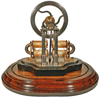 Ce petit moteur à courant continu ne porte aucune marque. Il est monté sur un socle en noyer de 4,5 x 5,8 cm et de 5 mm d'épaisseur. Seul déborde du socle l'arbre de transmission vraisemblablement prévu pour accueillir une poulie ou une roue dentée permettant, par exemple, d'animer un jouet ou un modèle réduit. |