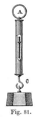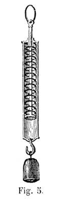 L'instrument est formé d'une lame d'acier recourbée en son milieu et portant à ses extrémités deux arcs en fer. Le premier est soudé, par son extrémité inférieure à l'une des branches de la lame d'acier tandis que son extrémité supérieure traverse librement l'autre branche pour se terminer par un anneau destiné à suspendre l'instrument. Le second arc est soudé par sa partie supérieure à la deuxième branche de la lame d'acier tandis que sa partie inférieure traverse librement la première branche et se termine par un crochet auquel on suspend l'objet à peser. Le poids de l'objet fait fléchir la lame d'acier en rapprochant ses deux extrémités. Ce rapprochement est mesuré par l'arc extérieur qui porte une graduation indiquant le poids du corps suspendu... |