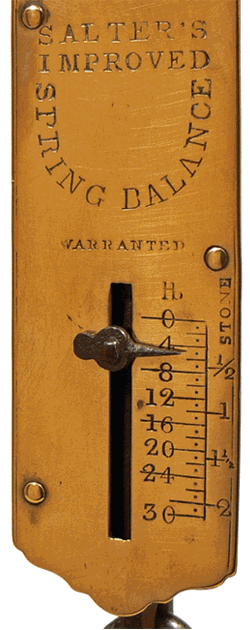 La graduation est réalisée en unités anglo-saxonnes, la stone et la livre (lb). La portée est de 30 livres soit un peu plus de 2 stone. Le cadran mesure 12 x 4,2 cm - la longueur totale est de 24 cm. |