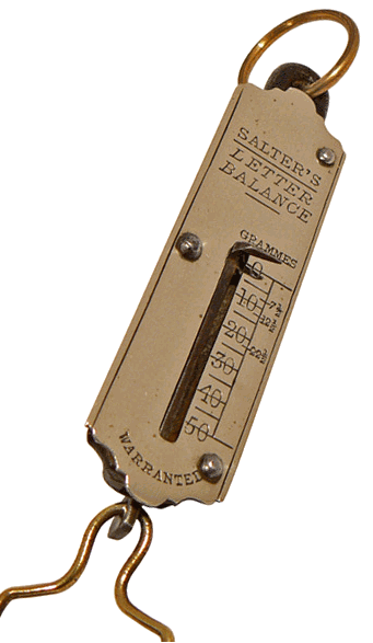 Pèse-lettres SALTER, gradué en gramme jusqu'à 50 g. Dimensions du cadran : 7 x 2 cm - Longueur totale : 17 cm |