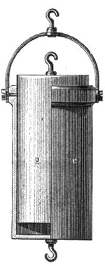Le double cylindre que l'on utilise pour vérifier le théorème d'Archimède : la capacité du cylindre creux, est égale au volume du cylindre plein. A gauche, sa représentation par Focillon dans son livre EXPÉRIENCES ET INSTRUMENTS DE PHYSIQUE, en 1884. |