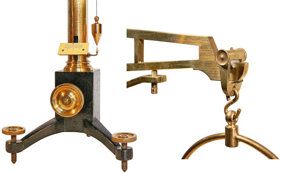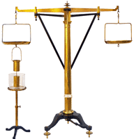 Cette balance à grande colonne est utilisée chaque fois que l'on a besoin d'un espace important sous les plateaux, ces derniers étant munis d'un petit crochet central permettant de suspendre différents corps ou dispositifs à soumettre à l'équilibre. C'est par exemple le cas du double cylindre utilisé pour la vérification du théorème d'Archimède... |