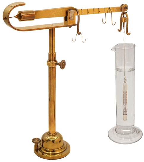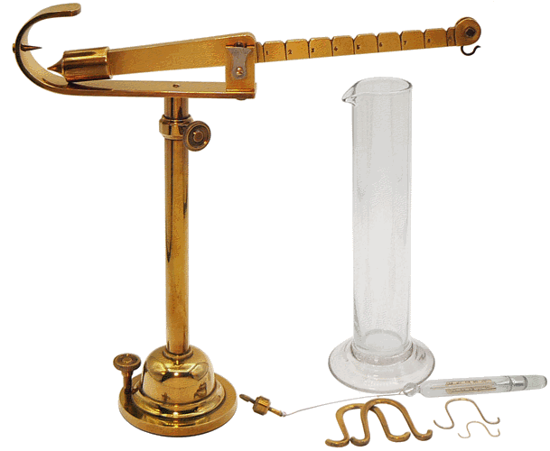 Balance de Westphal - hauteur moyenne 25 cm - A droite, ataché à un fil de platine, le plongeur thermométrique de 8 cm Vers 1910 |