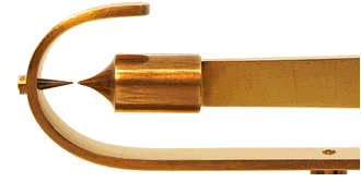 Avant toute mesure, le "zéro" doit être effectif lorsque le plongeur est suspendu par son fil de platine, seul et dans l'air, à l'extrémité du fléau. La correction est obtenue en agissant sur la vis calante du pied. |